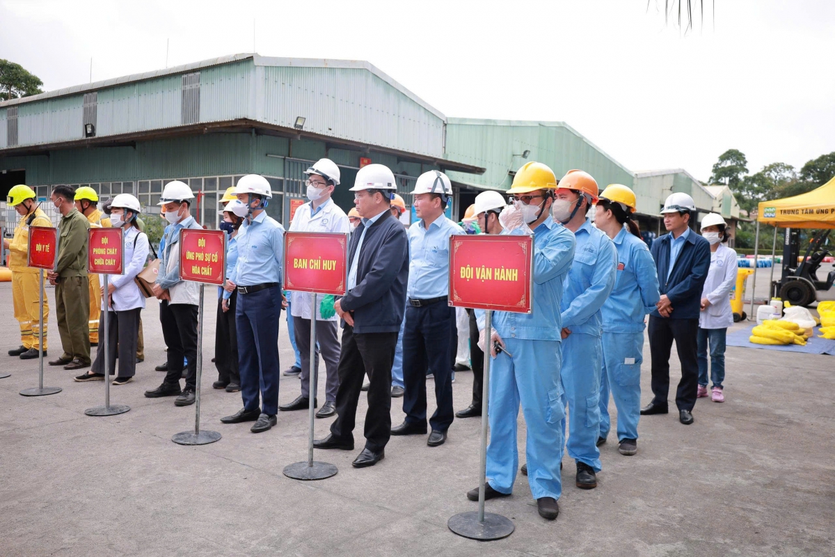 Điểm nhấn của chương trình là buổi diễn tập phương án ứng phó sự cố tràn đổ hóa chất trong quá trình di chuyển hóa chất từ kho ra khu vực sản xuất. Kịch bản diễn tập giả định tình huống tràn đổ hóa chất, yêu cầu kích hoạt quy trình cảnh báo, khoanh vùng, cách ly khu vực nguy hiểm và triển khai lực lượng ứng cứu.
